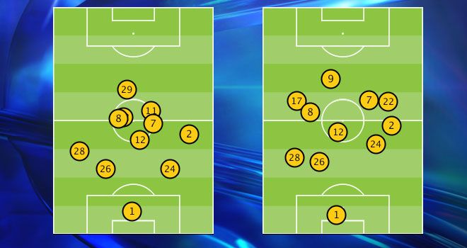 Chelsea in the first 55 minutes (l) without Hazard (17) before they added more width (r) when he came on
