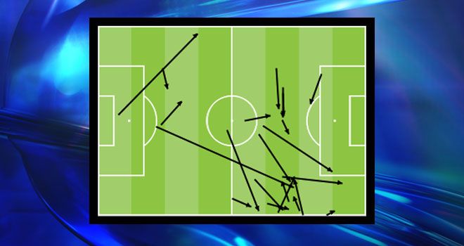 In contrast, Chelsea did not attempt a single shot, on or off target, in the first half. Samuel Eto'o had only 13 touches of the ball in that time, fewer than any other player on the pitch. That was because Chelsea failed to get the necessary service to their lone frontman, with Oscar (seven) and Willian (eight) attempting a disappointing amount of passes in the opposition half at poor respective completion rates of just 71.4% and 62.5%.